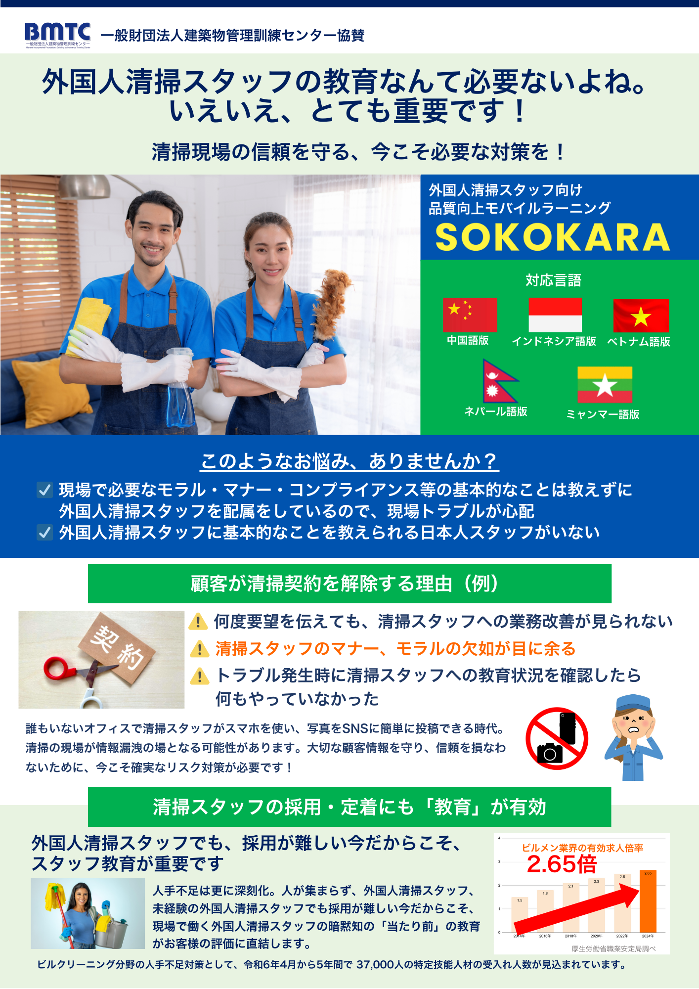 SOKOKARA清掃スタッフコースを「外国人清掃スタッフの教育」に活用できるプランについて、サービス内容・機能・価格等を2ページのチラシにまとめました。詳細についてのご説明やデモ等をご要望いただける際は本ページの「お問い合わせ」よりお気軽にご連絡ください。